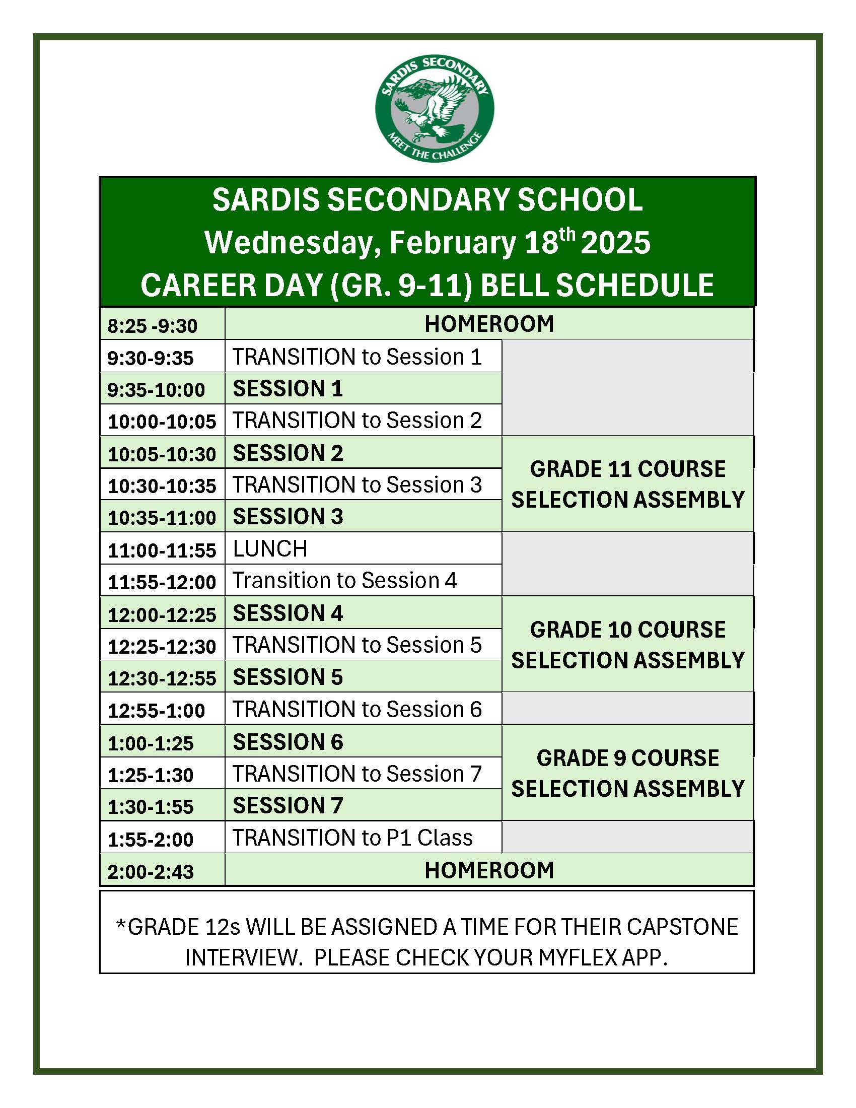 This is a mandatory full day for students Grades 9-11. Grade 12s have scheduled Capstone interview times please check MyFlex for your appointment time.