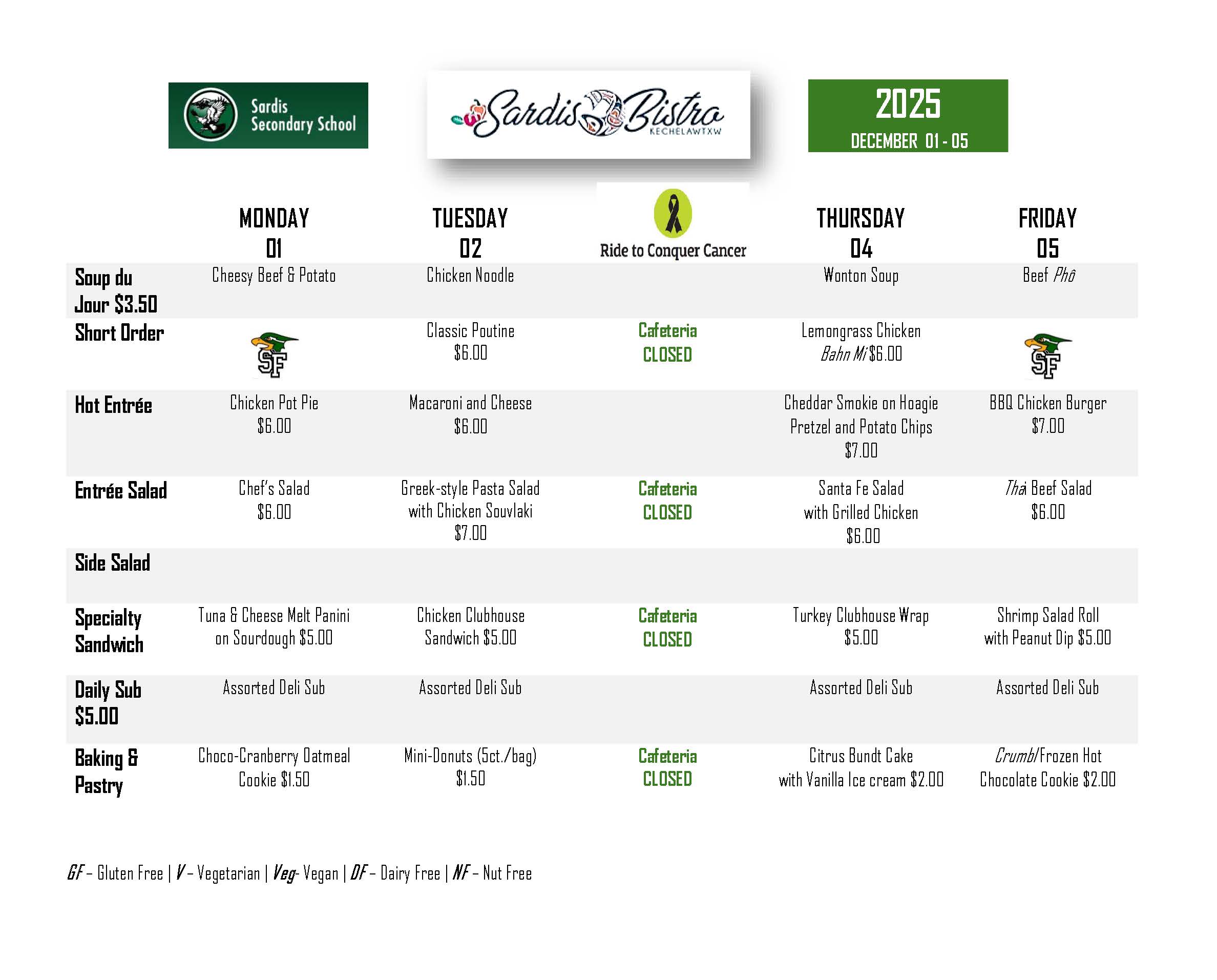 Prices and items are subject to change. Buy your Bistro lunch cards at the office or through StudentQuickpay! File Attachment Sardis Bistro Menu December 01 - 05.pdf130.85 KB