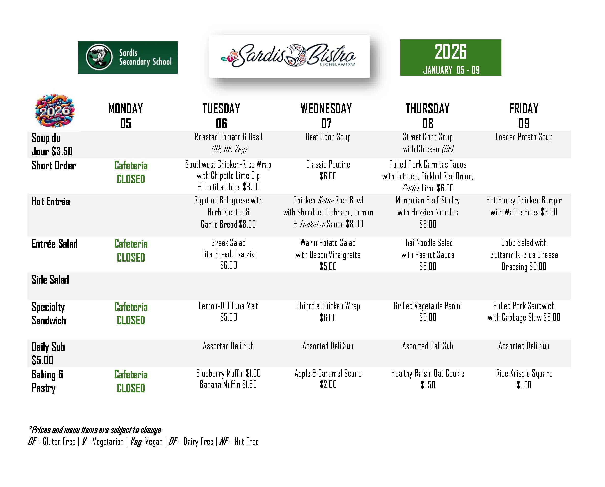Prices and items are subject to change. Buy your Bistro lunch cards at the office or through StudentQuickpay! File Attachment Sardis Bistro Menu January 05 - 09.pdf100.56 KB