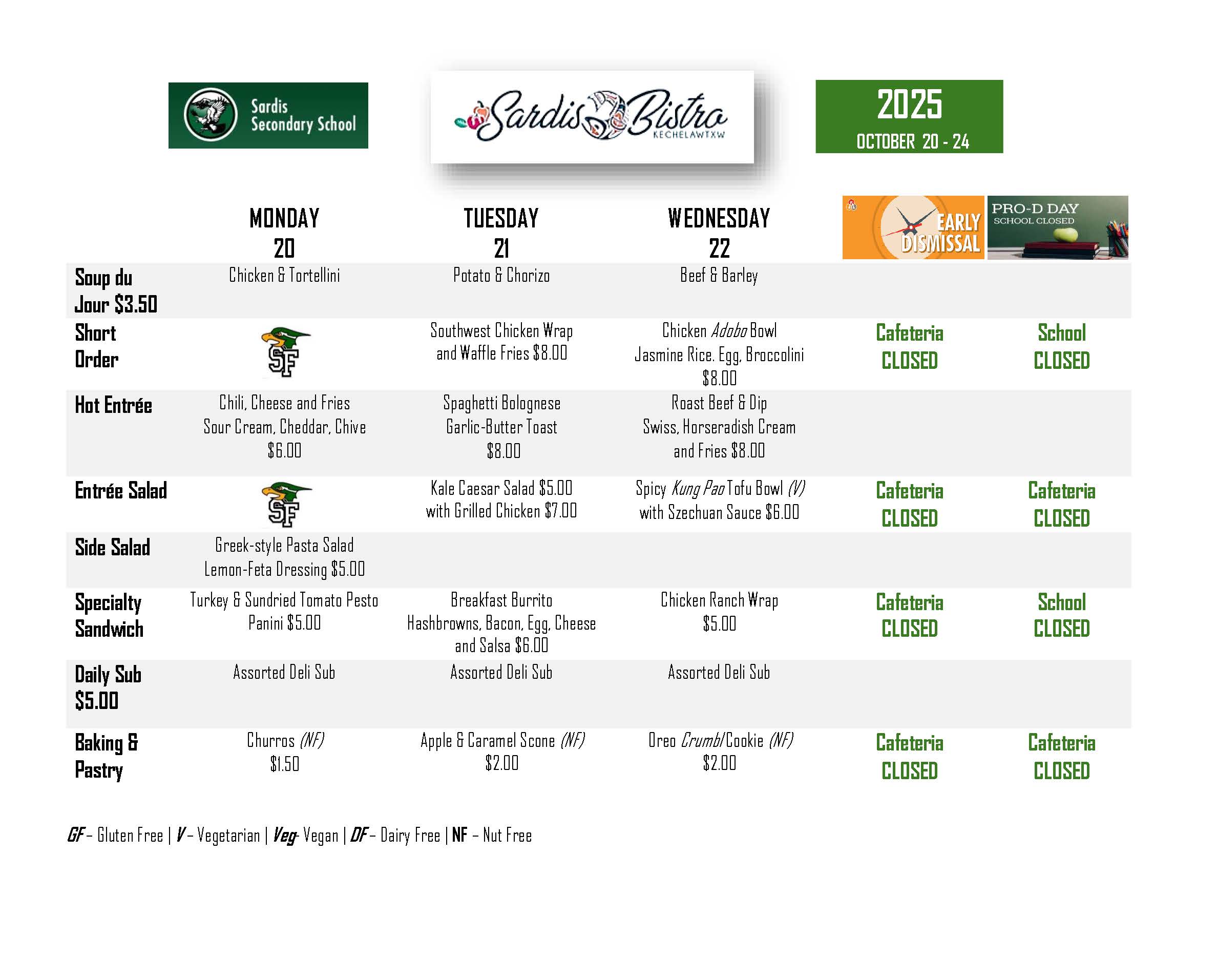 Prices and items are subject to change. Buy your Bistro lunch cards at the office or through StudentQuickpay! File Attachment Sardis Bistro Menu October 20 - 24.pdf112.24 KB