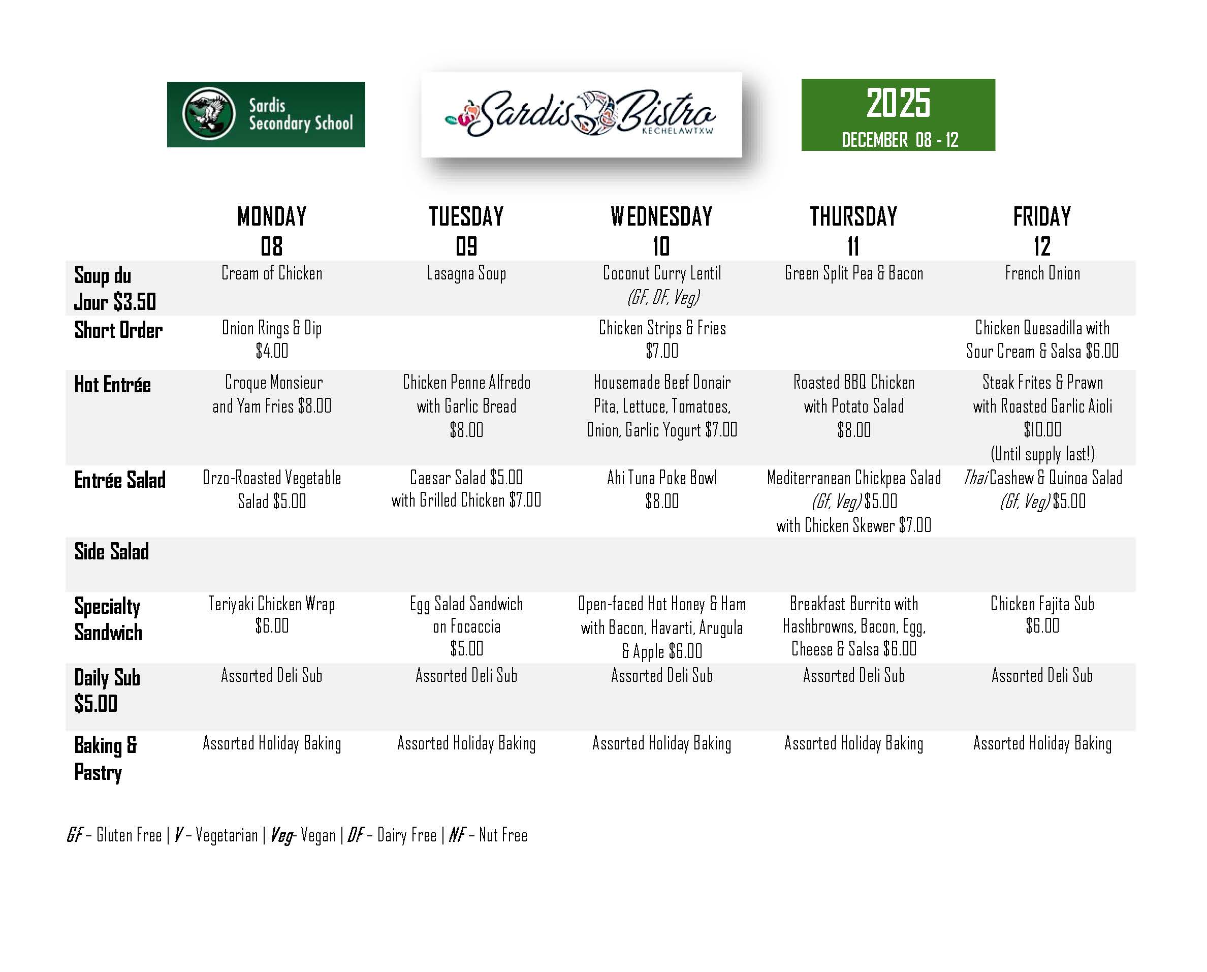 Prices and items are subject to change. Buy your Bistro lunch cards at the office or through StudentQuickpay! File Attachment Sardis Bistro Menu December 08 - 12.jpg272.41 KB